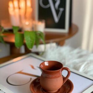 Kahve yanı su bardaklarının yapımında organik çamur kullanılmıştır. El yapımıdır. Doğal sır kullanılmıştır. Bulaşık makinesi ile yıkanabilir.
